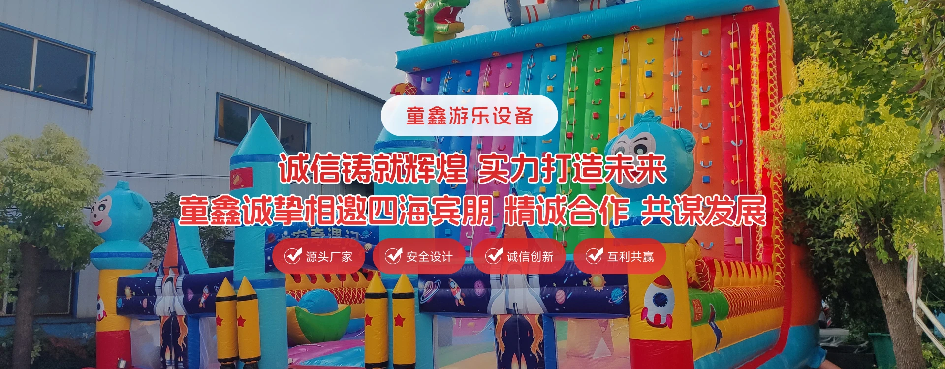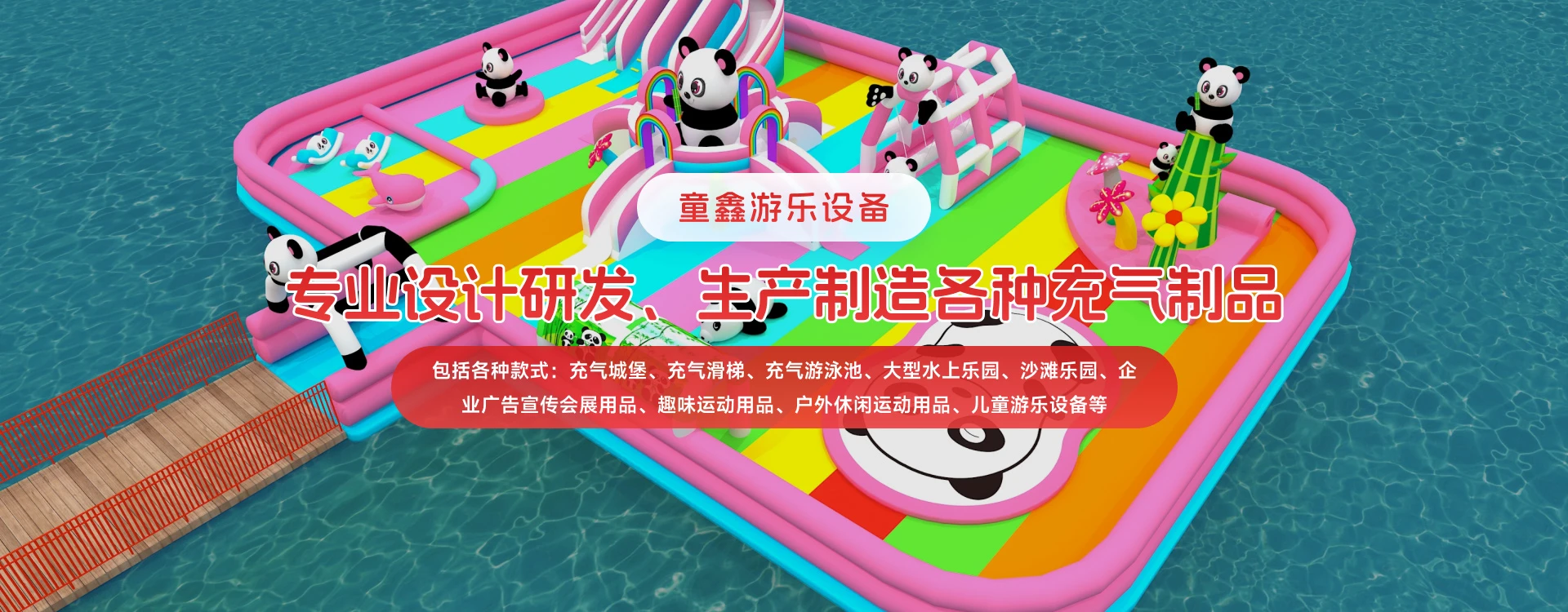 童鑫公司一个致力于打造国内外知名品牌的户外用品和游乐设备公司,专业设计研发、生产制造各种充气制品,包括各种款式:充气城堡、充气滑梯、充气游泳池、大型水上乐园、沙滩乐园、企业广告宣传会展用品、趣味运动用品、户外休闲运动用品、儿童游乐设备等。